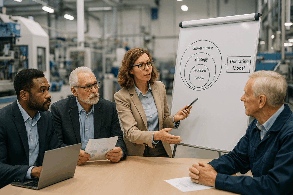 SmartValueFlow partners with manufacturing organizations to bridge the gap between strategy and consistent execution and achieve sustained business results. Our solutions integrate operational excellence, smart manufacturing, operating models, governance, and embedded capability building into a coherent system that improves performance and prepares organizations for continuous improvement.